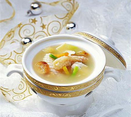 6、白果杏仁生鸡汤:取生鸡项一只,去内脏及皮,加入白果15粒,杏仁10克,陈皮3克,用线缝好,清水煮,吃肉喝汤。
