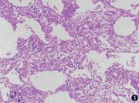 NSIP的病理表现:在增厚的肺泡壁内含有不同程度的炎症和纤维化。根据炎症和纤维化比例的不同将疾病分为3型:①细胞型,约占50%,主要表现为肺间质的炎症,很少或几乎无纤维化,是NISP最早的组织学表现。肺泡隔内的慢性炎症细胞主要为淋巴细胞和浆细胞浸润。其浸润程度比IPF更为突出;②混合型,约占40%,肺间质内有大量慢性炎细胞浸润和明显的胶原纤维沉着为特点,其病变相对一致,无蜂窝肺,部分病人可见少量成纤维细胞灶;③纤维化型,约占10%,肺间质内以致密的胶原纤维沉积为主,伴有轻微的炎症反应或缺少炎症。NSIP病变呈片状或弥漫性分布,但病变整个时相是一致的,很少有单纯性纤维化区,见不到IPF那样新老病灶并存的现象。支气管周围慢性炎细胞浸润,肺泡Ⅱ型上皮增生明显。灶性或片状肺泡腔内巨噬细胞聚集,常见多量泡沫细胞。近半数病例有灶性BOOP改变,所占比例很小。缺少急性肺损伤的小血管纤维素性血栓、肺泡腔内透明膜和上皮化生。
