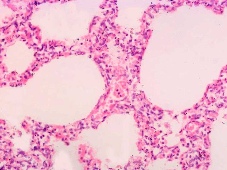 病理显示,肺大体标本呈暗红色,重量增加,外观饱满,质实变硬,触压不萎陷。肺切面为暗红色斑点与灰白色相间,并有交错分布的灰白纤维组织条索和小灶性瘢痕组织。光镜检查:早(渗出)期病变(肺损伤后约1周内)时,肺泡间隔因血管扩张、基质水肿和炎性细胞浸润而弥漫增厚,其中以淋巴细胞浸润为主,亦有浆细胞、单核(或巨噬)、中性和嗜酸粒细胞及少许成纤维细胞;肺泡上皮增生和化生形成柱状,加宽了肺泡间隔;肺泡腔内侧正常或有少许蛋白性物质及细胞渗出。此时的肺泡间隔相对较薄、肺泡结构尚正常,对治疗反应良好。随着病情的进展,血管内皮及肺泡上皮细胞受损、坏死和脱落;肺泡腔内形成均匀粉染的嗜酸性物质——透明膜。约2周时,DAD进入晚(增殖或机化)期,肺泡间隔出现广泛增生的成纤维细胞和肌纤维细胞,而胶原沉积却较少,这使得肺泡间隔明显增宽;毛细血管被纤维组织替代而数量减少;肺小动脉内膜增生、管壁增厚,有时在中小肺动脉内可见机化的栓子;肺泡因纤维化和闭锁而减少,残存的肺泡形状不规则、大小不一,或呈裂隙状或异常扩张。由于Ⅰ型肺泡上皮细胞的坏死,Ⅱ型上皮细胞增生、呈柱状或鞋钉样排列,衬于肺泡表面;这与UIP中有相当数量的细支气管上皮细胞参与分布于肺泡表面的情况有所不同。另外,呼吸性细支气管上皮可出现鳞状化生。数周后,蜂窝肺即可出现。