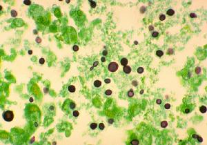 病原是卡氏肺囊虫,发滋养体与包囊,主要存于肺内。过去认为属于原虫,最近有学者根据其超微结构和对肺囊虫核糖体RNA种系发育分析认为:肺囊虫属真菌类。PCP的主要感染途径为空气传播和体内潜伏状态卡氏肺囊虫的激活。宿主对验证的反应和免疫应答包括肺泡巨噬细胞吞噬卡氏肺囊虫,支气管周围和血管区域淋巴细胞浸润,Ⅱ型肺泡细胞增值,局部及全身抗体增加等。