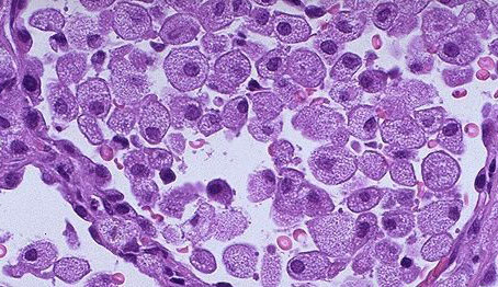 胆固醇肺炎,肺大体标本的切面可见灰色或黄色的外观。镜检:在肺泡和肺泡壁可见含大量胆固醇的巨噬细胞。核位于中央,苏丹染色,胞浆明亮。肺泡内皮细胞增生,并有不同程度的小叶间纤维化。