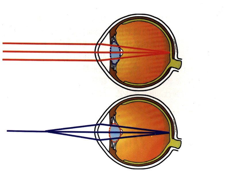 不论远视眼是由于眼轴的长度减短、屈光体面弯曲度减少,还是由于屈光率的降低,所引起的光学效果都是相同的。即从无限远处发出的平行光在视网膜的后方形成焦点,而在视网膜上形成模糊不清的像,由于眼轴变短,相应的视网膜向结点处靠近,所成的像则较正视眼要小些。在正视眼视网膜的黄斑处这点发出的光,经过眼的屈光作用,光线是平行的。也可以说正视眼的黄斑与无限远成为共轭焦点,所以,正视眼看无限远时不使用任何调节。而远视眼,由黄斑处所发出的光是散开的,这种眼的黄斑共轭焦点在眼球的后方,所以它是虚焦点,因为宇宙中不存在集合光,故这种眼处于休息状态时,看任何体都不清,为使光线变为集合有两种方法:第一是靠眼本身的调节作用,第二是配戴凸透镜。
