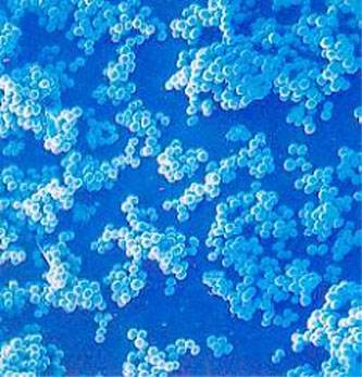 1.形态和分类 葡萄球菌为细球菌科、葡萄球菌属的一组革兰阳性球菌,共有22个种。繁殖期细菌排列成葡萄串状,故名。葡萄球菌大多为需氧或兼性厌氧生长,营养要求简单,在肉汤培养基中生长旺盛,孵育24h后培养即现混浊,并有部分细菌沉于管底。在肉汤琼脂平板上培养24h后菌落达3~4mm,圆形,边缘整齐,表面湿润光泽,不透明。在血琼脂平板上菌落周围可见明显的溶血环。在溶血者大多为致病菌株。