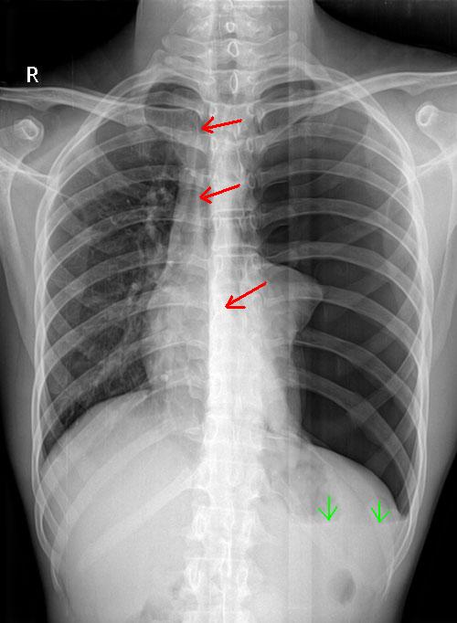 常见者如一侧肺大泡、张力性气胸、局限性阻塞性肺气肿、胸腔积液、肺囊肿和肿瘤等;或一侧肺不张、一侧全肺切除术后。也有因一侧胸腔病变产生瘢痕收缩而将健侧胸腔部分肺脏经纵隔结构薄弱区域牵拉进入患侧胸腔的,如见于肺结核纤维化、慢性胸膜炎瘢痕收缩等。