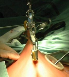 6.纤维结肠镜下治疗 发现气囊肿后,先用活检钳将气囊肿夹破,然后将内镜微波治疗仪的同轴电缆通过内镜活检孔插入,电极头伸出活检孔3~4cm,并接触囊肿进行凝固。微波输出功率可用40w,每次2~3s,治疗后局部黏膜呈灰白色凝固。此法具有组织损伤小、简便、安全等优点。