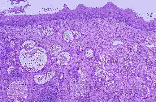 病理上把白塞病肠溃疡分为坏死型、肉芽肿型以及混合型。坏死型为急性、亚急性病变,肉芽肿型为慢性病变,混合型介于二者之间。镜下可见肠黏膜水肿,黏膜固有层和黏膜下组织内的肠淋巴管扩张。肠的血管病变为伴随溃疡出现的血管炎性变化,主要表现为血管内膜的肥厚。以黏膜下组织的血管,特别是静脉为明显。这种血管的病变与溃疡的大小无关,受时间推移的影响,急性期溃疡(坏死型)的血管病变比慢性期溃疡(肉芽肿型)血管炎性病变为轻。溃疡越深,血管病变越明显。而无溃疡的肠黏膜,多见不到明显血管炎性变化。这种血管病变与肺结核、克罗恩病、溃疡性结肠炎的血管病变基本上无太大差异。