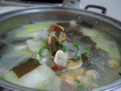 3)蛤蜊海带汤:蛤蜊肉100克,海带50克,水500毫升,烧开后,加入姜丝和精盐,再煮20分钟,下味精,淋麻油。分1-2次乘热食蛤蜊肉和海带,喝汤。适用于淋巴腺肿,甲状腺肿。