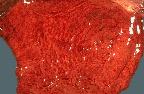 应激状态时去甲肾上腺素和肾上腺皮质激素分泌增加,内脏血管收缩,胃血流量减少,不能清除逆向弥散的H+;缺氧和去甲肾上腺素使前列腺素合成减少,黏液分泌不足,HCO3-分泌也减少;应激状态时胃肠运动迟缓,幽门功能失调,造成胆汁反流,胆盐进一步损伤缺血的胃黏膜上皮,使胃黏膜屏障遭受破坏,最终导致黏膜发生糜烂与出血。病变多见于胃底及胃体部,有时累及胃窦,胃黏膜呈多发性糜烂,伴有点片状出血,有时见浅小溃疡,覆以白苔或黄苔。组织学检查见糜烂处表层上皮细胞有灶性脱落,腺体因水肿、出血而扭曲,固有层有中性粒细胞和单核细胞浸润。