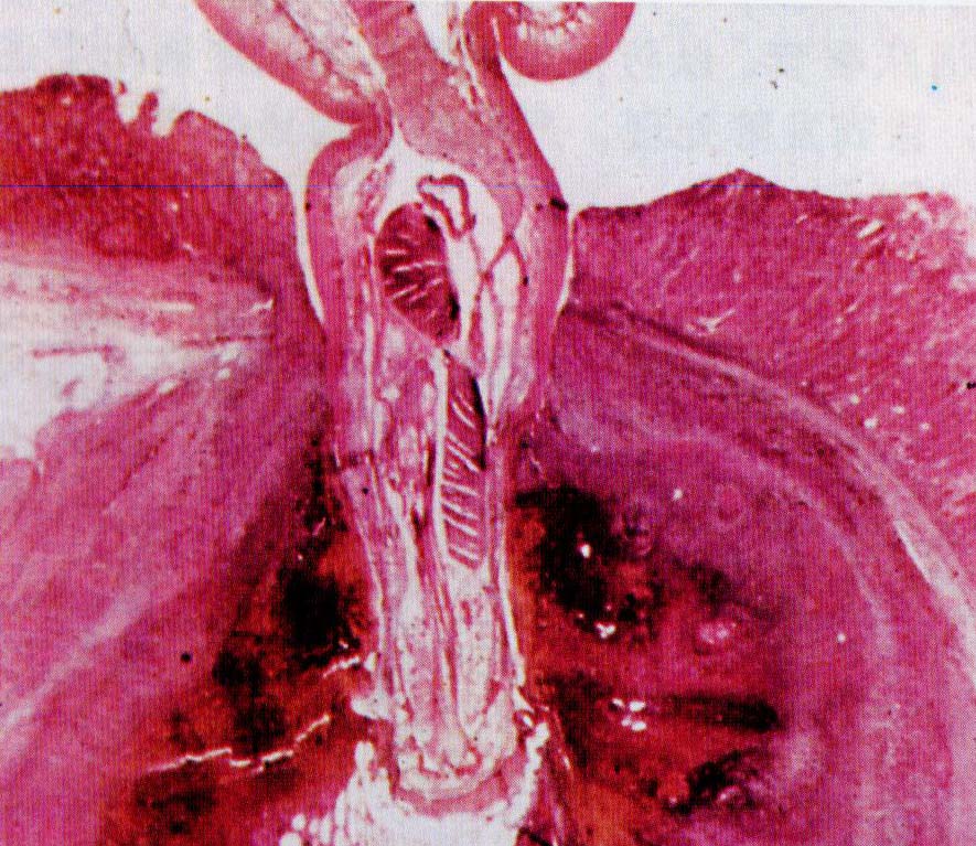 虫体吻钩附于肠粘膜上,造成粘膜组织充血、出血、坏死并形成溃疡。随后由于结缔组织的增生,局部形成包块。虫体损伤达肠壁深层造成肠穿孔,引起局限性腹膜炎。少数病人可由于肠粘连而出现肠梗阻。此外,常因虫体更换固着部位,使肠壁组织发生多处病变。