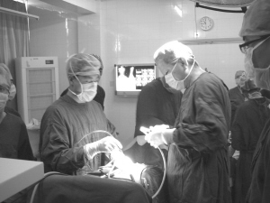 (2)经胸食管肌层切开术同时行抗反流手术:如前所述经左侧开胸探查食管。从后纵隔内游离食管,注意不要进入对侧胸膜腔,自主动脉弓至膈水平,充分游离食管,结扎切断主动脉至食管的几支分支血管。拉纱带绕过的食管近端,使前隔食管膜有张力,切断胃食管接合部的裂孔附着处,结扎及切断胃左动脉上升支及膈下动脉的分支。整个胃食管接合部及部分胃底可提入胸腔,切除位于胃食管接合部的脂肪垫,注意保留迷走神经,在胃食管接合部上方几厘米做食管肌层切开术如上述。