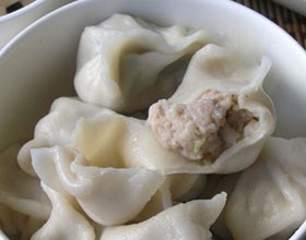 [制法]面粉与微量精盐,200克冷水相和,反复揉搓成光滑、柔软的面团,加盖,醒15分钟,白菜入沸水中烫软,剁碎,与鲜蘑末拌合,加姜末、葱花、黄酒、精盐、麻油、味精,调制成馅,把面团分60份,擀皮,包成饺子,入沸水中煮熟。