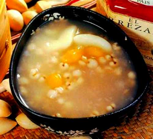 【做法】将茯苓、白术、桂枝、泽泻加水煎煮,取汁去渣备用,再将芡实、鲜山药、莲子肉、薏苡仁、大枣洗净蒸熟,兑入药汁,加粳米和水,再蒸40~50分钟即成。食前拌入红糖适量。