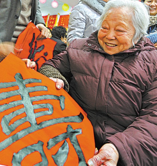 家住曙光三村的92岁沈秀卿老人收到社区工作人员送给她的新春书法作品。