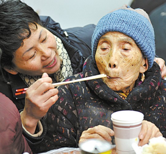 服务中心工作人员王金美给93岁的史美君老人喂肉片。
