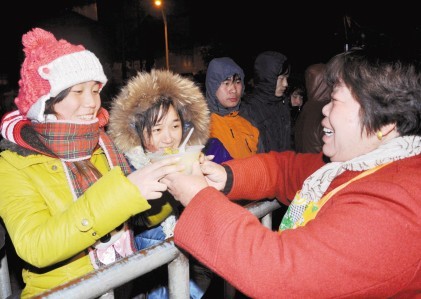 2011年春节前夕,北仑新碶街道玉兰社区64岁的陈杏娣独自一人为彻夜排队买票的外来务工者免费送上一碗碗热粥,传递着寒冬里的一抹温情。