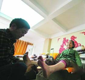 三里庵街道居家养老服务中心内,专业技师在给老人进行足底按摩。 晨报记者 王姗 摄