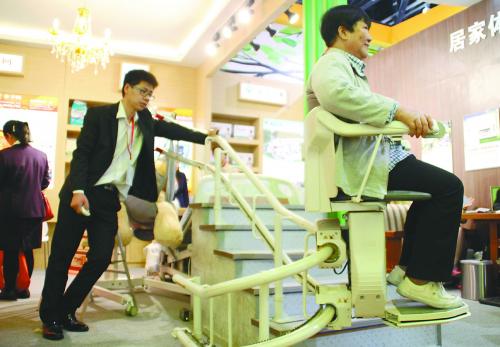 在北京举行的养老服务业博览会上,一位老人体验“电动爬楼梯”专用设备。