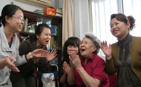 从张奶奶家出来,她们又来到了李传英服务的孤寡老人赵玉芳家中,88岁的赵老太膝下一双儿女,而已40多岁女儿偏偏又天生智力缺陷,照顾女儿的重担就落到了老太太身上,李传英对赵老太的服务已经有段时日,多少减轻了老太太的负担。他们到老太太家中后围坐在一起陪老太太聊天解闷,老人非常高兴。当然这两位老人仅仅是居家养老服务工作中的一角。