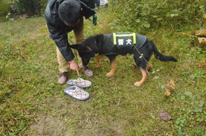 警犬“尤美”正在嗅老人平日所穿拖鞋。