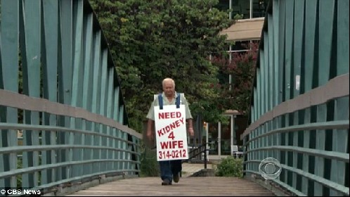 美国中文网报道:结婚57年,南卡一对古稀老人拉里和杰米一直彼此照顾相爱着对方。体弱的杰米出生时便只有一颗肾,在常年肾病折磨下,杰米仅有的一颗肾也开始出现衰竭,但不幸的是,拉里和他家人的肾都与杰米不匹配。于是77岁的老人拉里决定自己走到大街上,去向陌生人为妻子求一颗肾。拉里每天走在家乡南卡安德森市的街道上,壮实的肩膀上背着一块巨大的广告板,上面写着“NEED KIDNEY 4 WIFE(为妻子求肾)”。