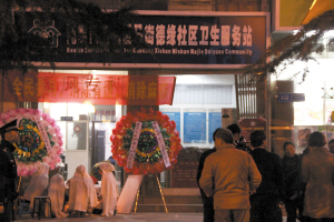 前天下午,一位老人在兴苑路德源社区卫生服务站输液后突然去世,没得到满意答复的家属昨天在门口设置灵堂。