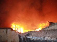 消防人员赶到现场时,大火猛烈燃烧,并伴有大量浓烟,不时有瓦片、木头掉落,消防人员用水枪对着火民房进行扑救。