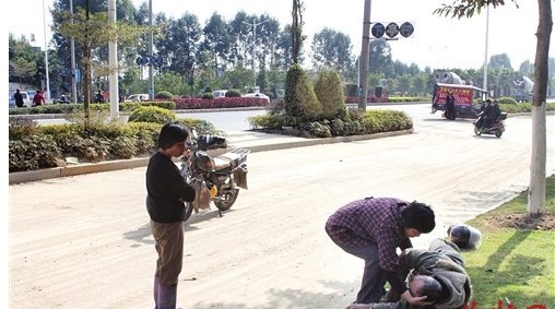 这时,一位骑着摩托车的老人从附近的一个路口拐到这段辅道上,突然,摩托车的轮胎打滑了,猝不及防的老人连人带车摔倒在路面上。记者赶紧上前察看,只见老人的嘴角磕破了,身上满是尘土,表情十分痛苦。之后,在当地居民的帮助下,老人被扶到一旁的绿化带上休息。而他的家人在接到通知后很快赶到现场,将其接走救治。其家人介绍说,老人今年将近60岁,就住在附近的下亭村,刚刚骑车出门,不想就发生了意外。