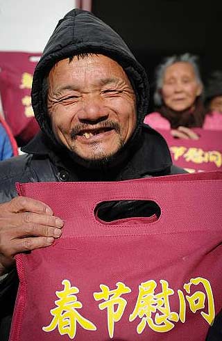 1月18日,板舍村“五保”老人储德碰收到慰问品。当日,安徽岳西县民政局的工作人员来到毛尖山乡板舍村敬老院,为这里的20位“五保”老人送上冬令慰问品,包括棉衣、棉裤、棉袜、围巾和手套等御寒衣物。据了解,该县今冬安排1160万元的资金用于对“五保”“低保”和生活困难群众的帮扶,将于春节前陆续发放完毕。新华社记者 杜宇 摄