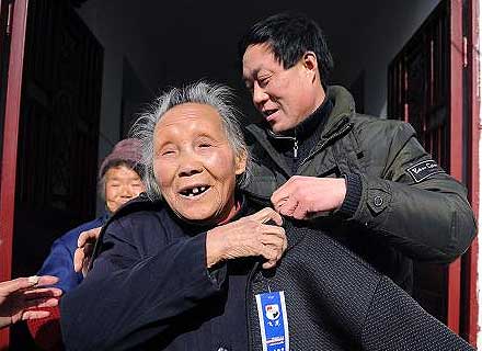 1月18日,板舍村“五保”老人仰秀英在试穿刚收到的棉衣。新华社记者 杜宇 摄