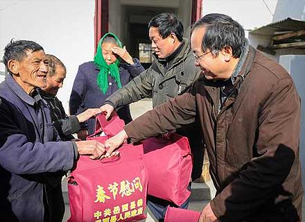 1月18日,岳西县民政局工作人员为五保老人发放慰问品。新华社记者 杜宇 摄