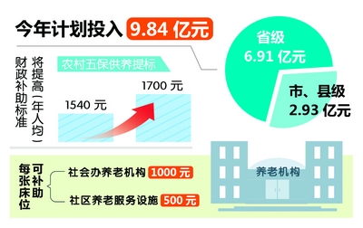 今年计划投入的9.84亿元中,省级安排6.91亿元,市、县安排2.93亿元。其中,农村五保供养提标将投入资金7.86亿元,财政补助标准将从年人均1540元增加到1700元。五保供养服务机构建设将投入1.68亿元,新建2万张床位,每张床位可获补助8400元。此外,省级还将安排3000万元资金,用于社会办养老机构和社区养老服务设施一次性建设补贴,社会办养老机构每张床位补助1000元,社区养老服务设施每张床位补助500元。