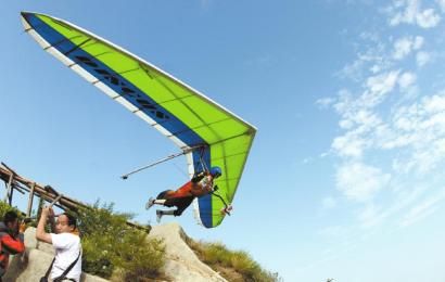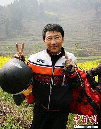 2009年7月18日,西安,“中国第一飞人”衣瑞龙自驾无动力三角翼悬挂滑翔机成功飞越海拔2086米华山西峰。(资料图片)