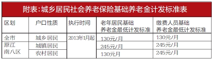 据介绍,本次待遇调整对象为:年满60周岁的居民养老保险基础养老金领取人员和基本养老金领取人员。原领取新型农村社会养老保险和城镇居民养老补贴年龄不满60周岁的人员继续按原标准领取。调整项目和标准为:全市城乡居民基础养老金最低计发标准由原100元/月调整为130元/月,每月增加30 元;原江南八区:城镇老年居民基础养老金计发标准由原220元/月调整为245元/月,每月增加25元;农村老年居民基础养老金计发标准调整为130元 /月;缴费人员基础养老金计发标准调整为245元/月。