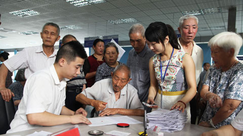 “贷了款买了养老保险,现在我和老伴每个月都领1100多元,生活完全没得问题。”6月19日,在政务服务大厅里办理着养老保险的第四期贷款手续,四川省泸州市龙马潭区鱼塘镇枣林苑社区的82岁老人赖俊才一脸的喜悦。近年来,该区政府为“媒”,近千名老失地农民高兴领取上了养老保险金。