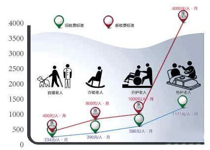 根据物价部门此前的价格标准——民政部门主办托老服务机构护理费标准,目前上述4个等级的现行收费标准分别为234元、390元、586元和1171元。前后相比,此次面向公众征求意见的拟订收费价格上涨了71%、105%、71%、242%不等,平均涨幅122%。