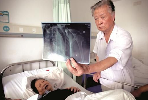 老人倒地,其中一人骨折。昨日,75岁的王婆婆躺在武汉市三医院里,右肩绑着绷带,表情痛苦。