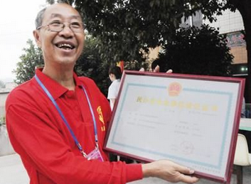 杨美学笑着向记者展示他的《民办非企业单位登记证书》,这张证书意味着他的助养院正式摆脱“黑户”身份了(9月18日摄)。