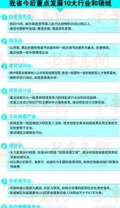养老、医疗、金融以及各种商务服务等行业和领域。力争到2020年,服务业总量显著扩大 ,就业容量明显增加,体制机制更加完善,开放水平全面提高,市场竞争力持续增强,总体发展规模 、质量和层次与经济文化强省建设的要求相适应;服务业增加值占生产总值的比重达到50%左右,基本形成服务业占主导地位的经济结构。
