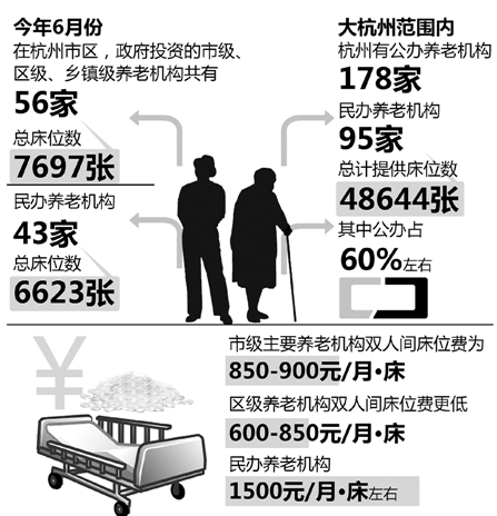 大杭州范围内,杭州有公办养老机构178家,民办养老机构95家,总计提供48644个床位,其中公办占60%左右。公办养老机构的价格,普遍比同类型的民办养老机构低。