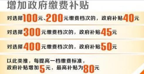 除基础养老金外,政府缴费补贴也有所增加。目前全省新农保和城居保制度设置100—1000元共10个缴费档次。从1月1日起,相对应的参保缴费补贴各增加10元,达到每人每年40-80元。其中,对选择100元、200元缴费档次的,政府补贴40元;对选择300元缴费档次的,政府补贴45元;对选择400元缴费档次的,政府补贴50元;以此类推,每提高一档缴费标准,政府补贴增加5元,最高补贴为80元。所需资金按省政府常务会已批准的省财政对各地补助比例执行。