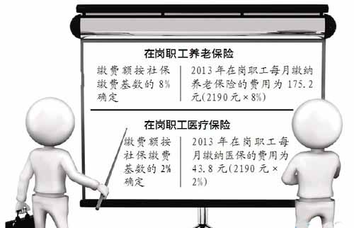 以在岗职工养老保险缴费额为例,按社保缴费基数的8%确定,2013年在岗职工每月缴纳养老保险的费用为175.2元(2190元×8%)。