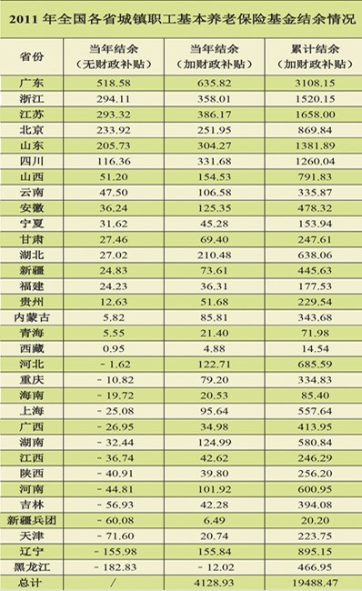 记者还注意到,一些媒体仅引用报告中部分省份亏空的观点,没有提到报告的另一项内容——18个省份养老金有盈余。据报告统计,剔除财政补贴,2011年18个省份盈余1957.07亿元。也就是说,即使不含财政补贴,从全国范围来看,养老金仍有结余。