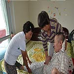 今年58岁的程一键老人从小患有小儿麻痹没有成过家,一直有父母抚养。自从去年父母双亲相继去世无人照顾,因此,他所在的青年路三社区主任通过电视台呼吁照顾谁能照顾他的生活。这时住在尖草坪房苑小区的李香苗老人从电视上看到程一键的情况,非常同情可怜他就把程一键接到自己家里。如今,程一键在李香苗家中受到百般关心和照顾已经九个月了。原来躺在床上不能动弹的老程气色满好,而且,在李香苗和好心邻居张孝香的搀扶下能够坐起来。
