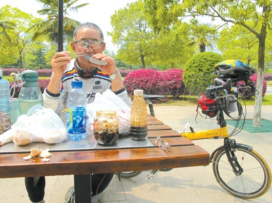 骑行路上,除了欣赏风景、感受各地的风土人情,滕川远还喜欢捡拾废铁,铁块、铁钉、铁丝什么的,他见了就捡起来,装在袋子里,见到收废品的就卖掉。滕川远说,他两个孩子的工作、生意都很好,生活得也很好,他自己也有退休金,家里还有一处房子出租有租金收入,自己不缺钱,这么做不是为了几个钱,而是担心这些废铁成为交通隐患,轻则硌脚,重则扎坏过往车辆的车胎,甚至可能带来生命危险。