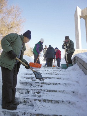 昨日7时许,记者在南湖公园英雄纪念碑下见到了这几位大爷,他们全副武装,穿着厚厚的羽绒服、脚上穿着大棉鞋、带着满面笑容、扛着铁锹,相聚在纪念碑下,只要一下雪,他们就有一个共同的任务——清雪。