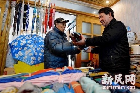 3月5日上午,共康八村82岁杨焕荣老伯早早起来,将100把经他整修、重新制作的“爱心便民伞”放在桌上,等待虹口区绿化管理署的工作人员来取。这是他第7次向绿化管理部门捐赠“爱心便民伞”,希望通过绿化管理部门将这些伞下发到各公园,供游客和居民使用。
