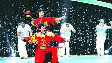舞台上,老人们抖动空竹时姿势多变、绳索翻花,串绕、抡高、对扔、过桥、叠罗汉等各种精彩动作不断,还创新性地将空竹加上“龙尾”展示舞龙动作,看得人眼花缭乱。“我们这个节目排练只有两三个月时间,参加央视节目是我们第二次上台,相当紧张。”刚从央视夺奖归来的空竹队队长杨惠民介绍说,他学习空竹已经有几十年时间,但有些队员只学习了几个月。