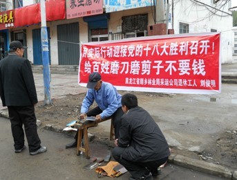 3日,沈阳市红巾社区居民各显神通,为大家提供免费服务。10时许,红巾社区院里,十几位居民排成长队拿着菜刀、剪刀等在一旁。“社区每周有一次免费的磨剪子、抢菜刀、免费理发,桌椅板凳维修。”一名正在排队的大娘手里拎了3把切菜的刀,“刀有些钝了,希望能磨快些。”