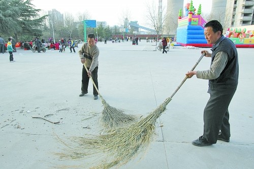 昨天下午6点左右,记者在三北体育场南侧找到了两位老人,他们正拿着大扫帚清扫垃圾(如图)。