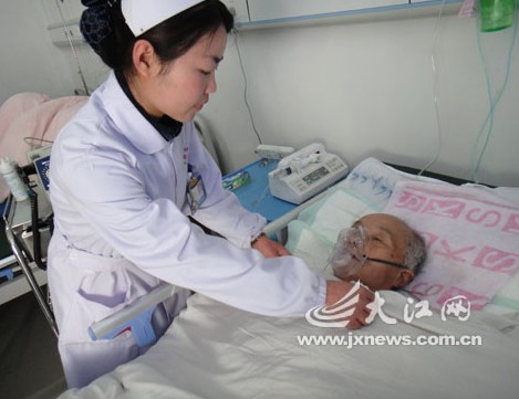 在上饶市第五人民医院心血管科的重症监护室,记者见到了插着氧气管的毛献弥老人。据医生介绍,老人是2月20日入院的,突发心肌梗塞,至今仍未脱离危险期,院方已经给他下了好几次病危通知。